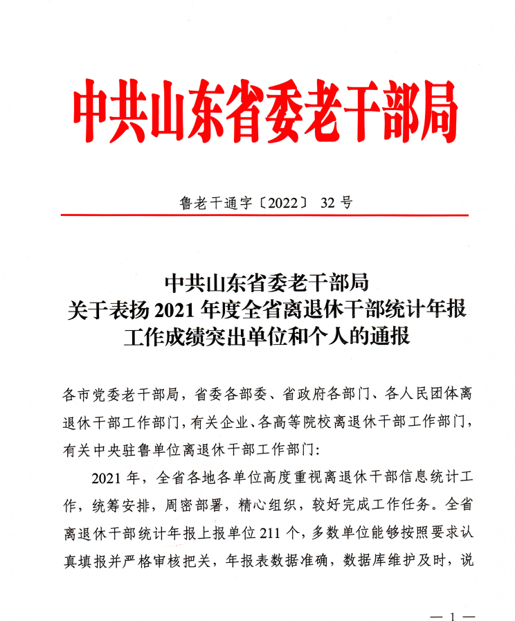 2022年12月12日,中共山东省委老干部局发出通报,对2021年度全省离退休干部统计年报工作成绩突出的单位和个人进行通报表扬,我校退休工作处及填报人张鑫焱同志以全优等次位列榜中。